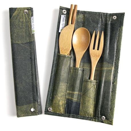 114280SLT000 Features: Get your own set of bamboo cutlery in a completely recycled holder created by Delhi-based NGO project, CONSERVE; each holder is crafted with recycled bags and newspapers Each utensil is crafted from durable, sustainably grown bamboo that's lightweight, long-lasting, and finished with high-quality, natural, and food-safe wood oil Don't be afraid to use these utensils to they're resistant to heat and stains; plus, they do not impart or absorb flavors Set includes a knife, spoon, fork, and chopsticks Specifications: Material: bamboo (cutlery); recycled plastic (holder)